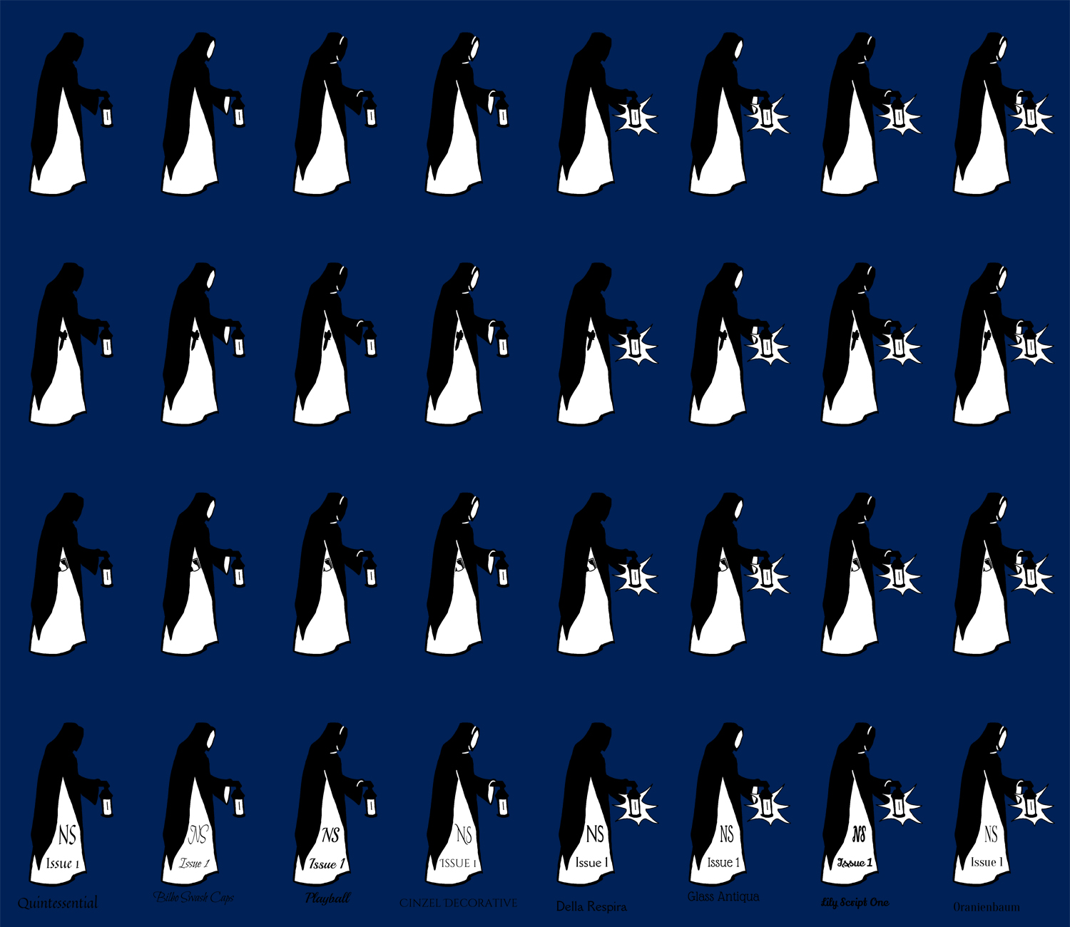 The eight figures on each line show the image with three variables, extra detail lines, showing the inside of the hood and sleave and glow from the lantern. The first three rows are a variance in what the figure is holding, either nothing, a knife, or a book. The final row is an example for eight different fonts in the style we were looking for. With all the options laid out here Christina and I decided to go with the last figure from the top row and use the Cinzel Decorative font. The final result being the logo you see below.